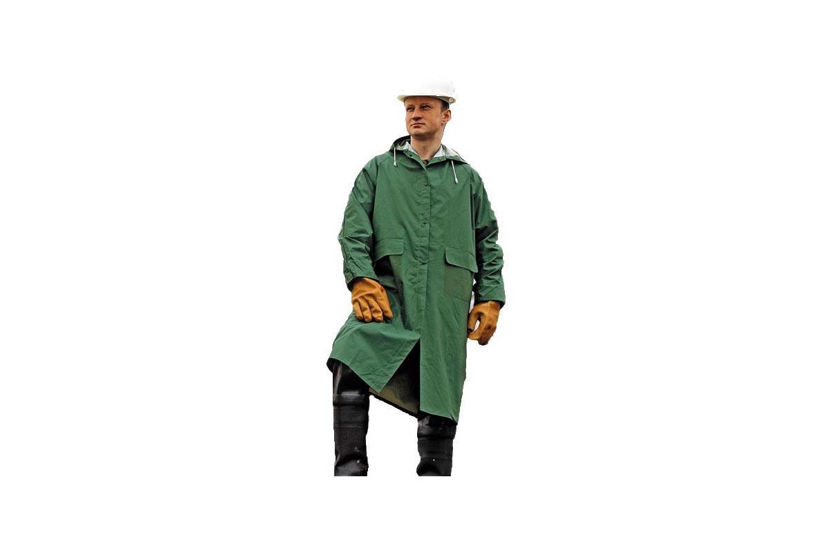 Швы сварные. Центральная застежка на кнопках, два накладных кармана, капюшон. Очень легкий и компактный, быстро сохнет. Ткань: ПВХ-материал на нейлоновой основе. Цвет: зеленый. ГОСТ 12.4.134–83.