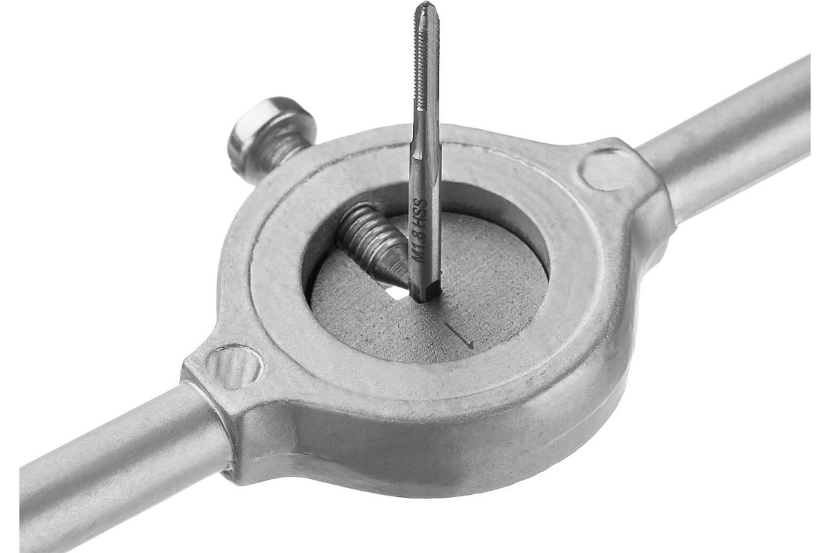 - Плашкодержатель со стопорными винтами обеспечивают стойкую фиксацию и центровку плашки;