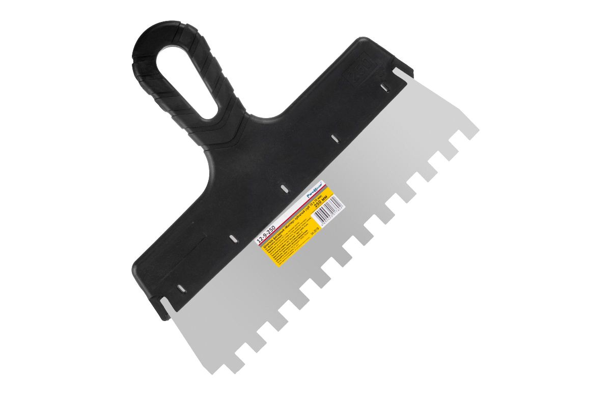 Фасадный шпатель РемоКолор 12-9-250 предназначена для нанесения и разравнивания плиточного клея на горизонтальных и вертикальных поверхностях. Полотно с зубьями 10х10мм подойдет для облицовки стен крупными плитами. Прочное полотно шириной 250мм из нержавеющей стали, позволяет наносить раствор с большой вязкостью. Рукоятка выполнена из пластика и имеет эргономическую форму, что обеспечивает удобство при работе.