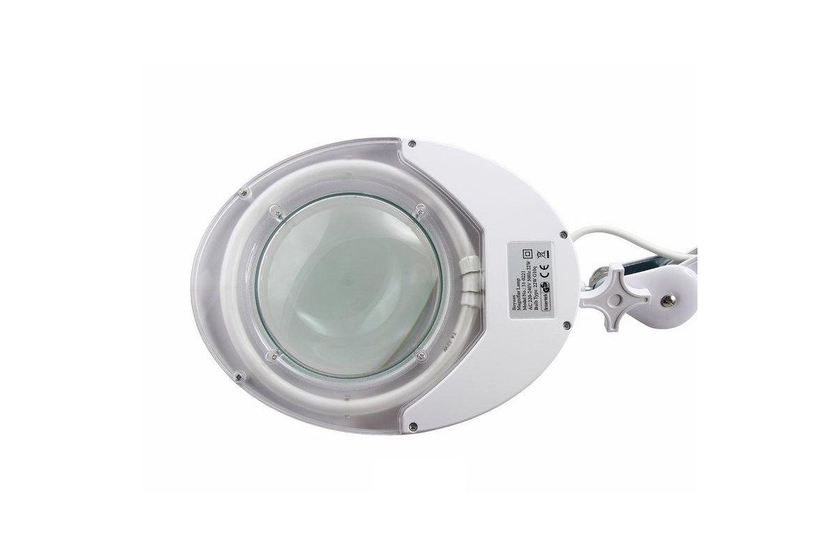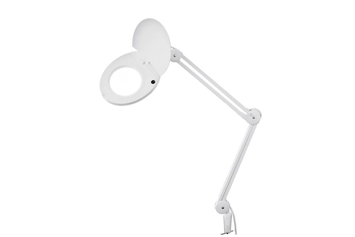 Лупа на струбцине круглая настольная с подсветкой с крышкой, белая предназначена для визуального увеличения различных мелких предметов или их фрагментов. Она используется в косметологии, в тату-салонах, при выполнении ювелирных и радиомонтажных работ, при ремонте часов, в биологии и медицине, в швейном и вышивальном деле, для организации труда людей со слабым зрением, а также для других работ, где требуется дополнительное увеличение и подсветка рабочего поля.