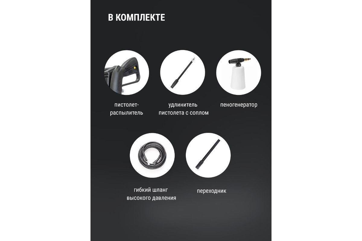 Мойка высокого давления 2750Вт, рабочее/максимальное давление 140/195 Бар, рабочий расход жидкости 490л/ч с функцией самовсасывания; помпа металлическая, функция авто- стоп. В комплекте: пистолет- распылитель, удлинитель пистолета с соплом, шланг высокого давления 5м, пеногенератор, кабель 5м, питание 220В+/-10%, 50Гц